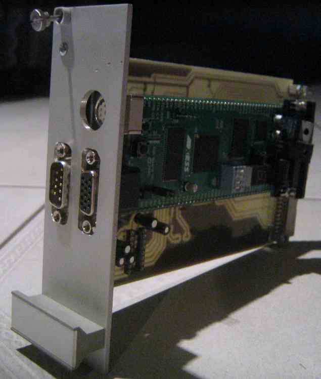 After doing some search, i found out that it is not so difficult to generate a VGA signal with FPGA's, so i ordered a board equiped with a xilinx XC2S200, the XSA-200 Board from XESS. I selected this board because it is small enough to fit onto an euro card (100 time 160 mm) and can be plugged into a simple socket using a raster of 2,54 mm.